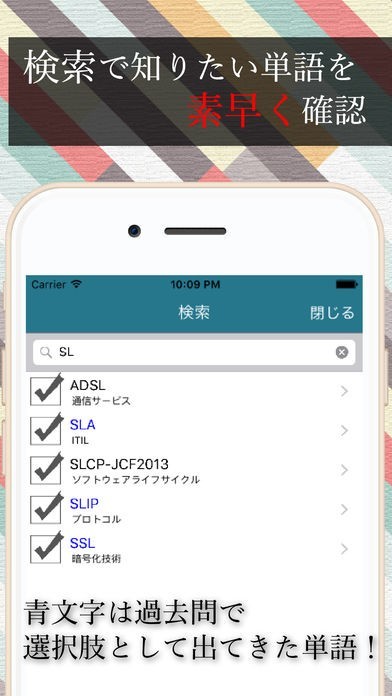 テキスト学習時や過去問演習時に意味が分からない専門用語に遭遇した時に、さっと検索できるので学習効果が高まります。ブルーで記載された用語は実際に過去問で選択肢として出題されたことのあるワードを意味しており実践的に学ぶことができます。