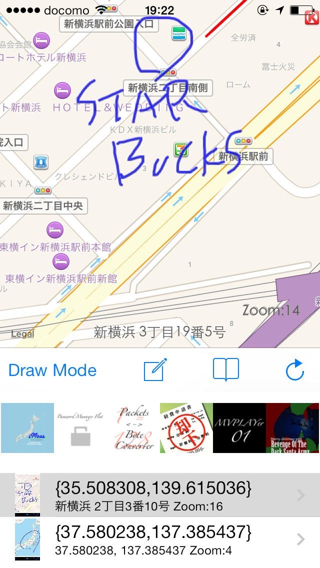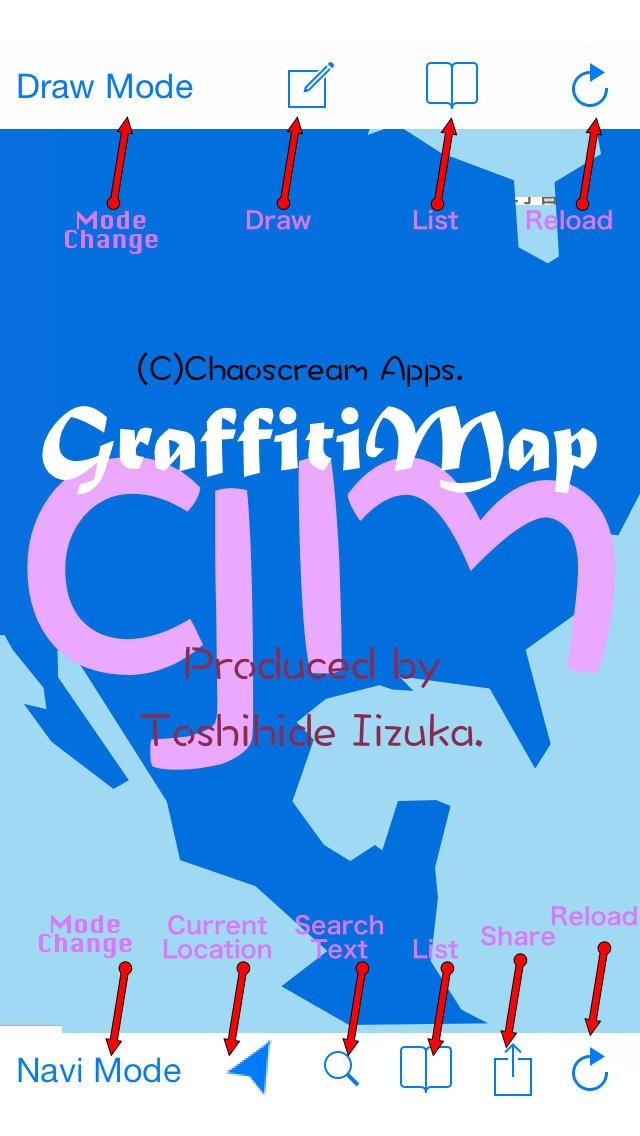 世界地図の上に自分で手描きの絵やメモを書き加えられるアプリです。手描きの色や線の太さを変えることができ、カラーは12色用意されています。 手描きができるDraw ModeだけでなくNavi Modeも搭載されていているので、一般的なナビゲーション機能も利用できます。住所や地名を検索したり地図上を長押しすると、現在地から経路を引くことができます。 地図画像をTwitterやFacebookに投稿したり、メールで送って簡単に共有できます。