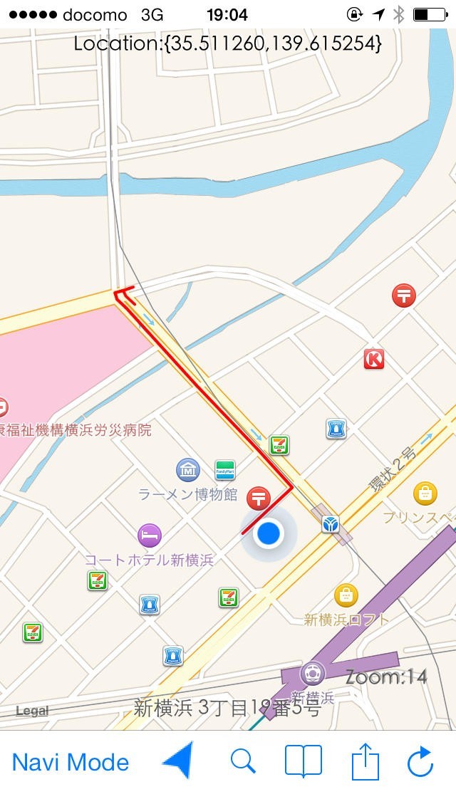 Navi Modeで地名を検索すれば現在地から経路を引ける