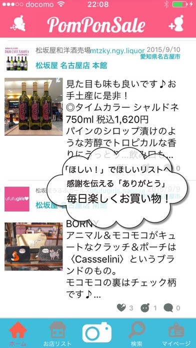 「ポンポンセール!」は、近くで開催されているセール情報を手早くチェックできる便利ツールです。 GPSとの連携が可能。現在地から近い場所でセールを行っているお店を自動的に見つけてくれます。 気になる商品や購入したいアイテムは「ほしいものリスト」に登録しましょう。 作成したリストはお買い物の際のチェック用としても役立てることができます。 さらにユーザー同士の口コミによって、チラシには掲載されないとっておきのお買い得情報を共有できるようになっています。