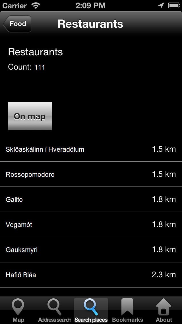 •マップエリアを選択することで、興味のあるあなた点(公園、カフェ、銀行および多く)に最も近いを見つけるためには、マップ内の任意の点の周りに検索することができます