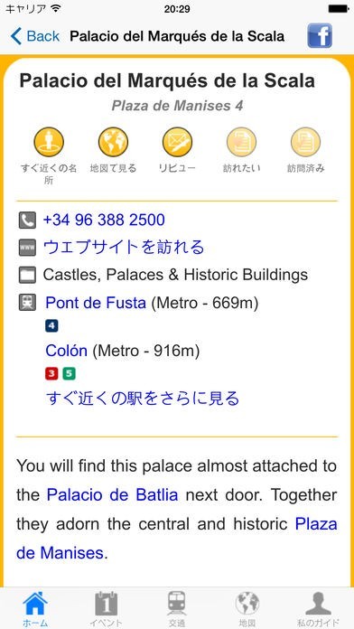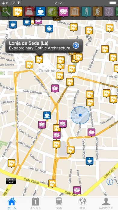 アプリでは現在地と、周辺の名所が地図に表示されます。バレンシア旅行で使えば、すぐに観光スポットや歴史的重要地域を探すことができます。楽しい旅のサポートをしてくれるでしょう。