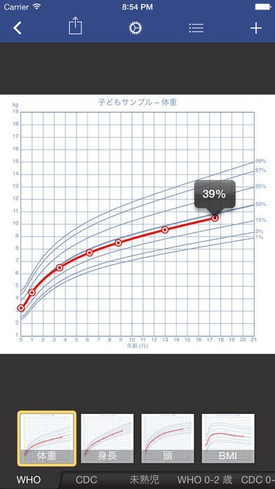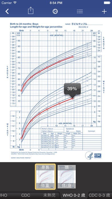 赤ちゃんや子どもの身長や体重をグラフ化して、成長の様子を詳しく見ることができます。参考にするのは、WHOおよびCDC成長チャートなので、信頼できるデータと比較ができて安心です。