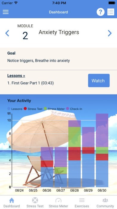 When you keep track of your development, you own it. Track your progress through the daily exercises and a unique stress test that chronicles your mood and anxiety levels throughout the day, so you gain invaluable insights into triggers and behaviors that occur in your body and mind. You will end your day on a healthy note with specific practices before bed for a restful sleep.
