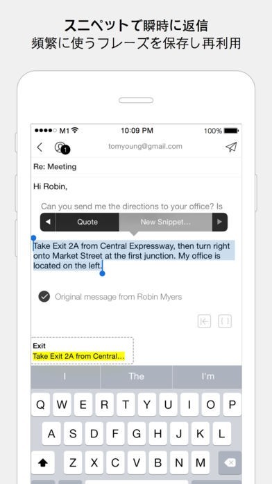 メールをスワイプして削除・お気に入り登録・スパム定義・アーカイブ、スニペット (定型文章) を挿入してすばやく返信、他のアプリと連携してメールの内容を処理できます。