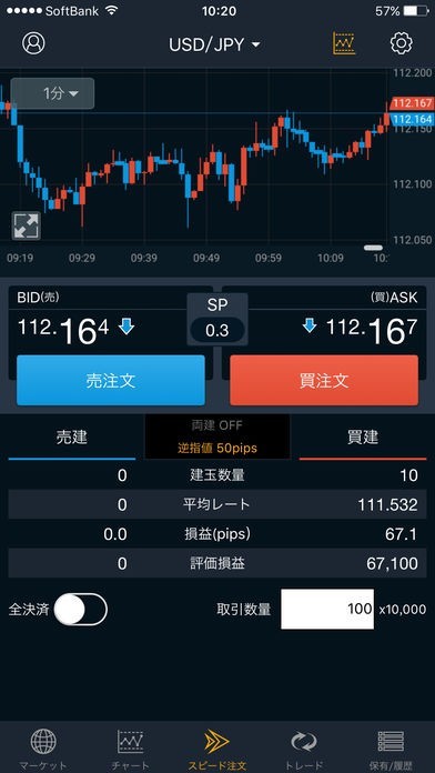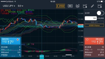 チャートを見ながら、1タップでスピード注文(新規・決済・ドテン・全決済)をご利用いただけます。