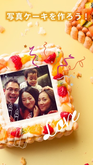 自分お気に入りの写真をアプリで画像アップロードするだけで、写真ケーキが作れるアプリです。写真の加工も可能となっています。またケーキの味は2種類、大きさは3種類から選ぶことができます。