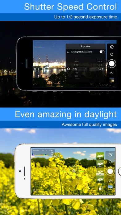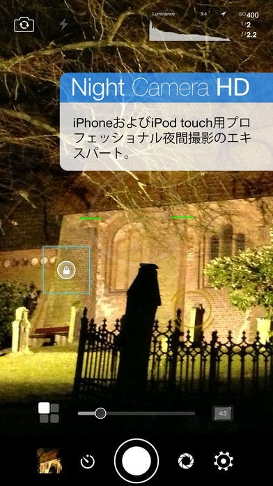 夜景や星空の撮影など、夜間で光源が少ないシチュエーションでもISOや露光機能を強化しているので、きれいな写真を容易に撮影することができるようになっているカメラアプリです。