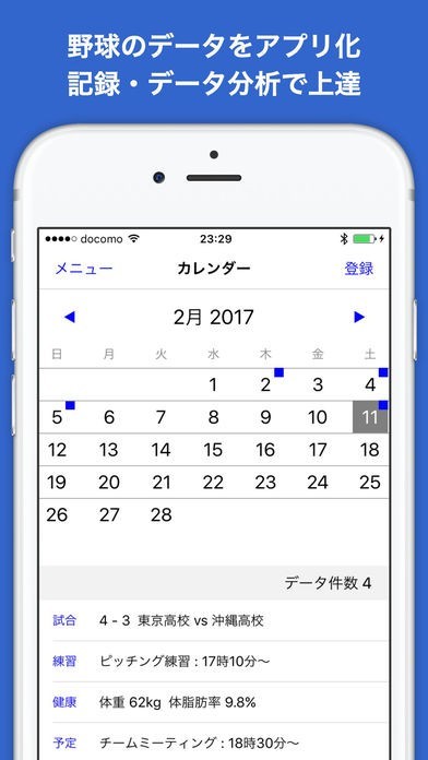 野球専用に作成されているカレンダーに今後の練習試合の予定や大会の日程を記録してわかりやすく管理できるのでスケジュールの計画を立てたりミーティングの時に便利に使用できます。
