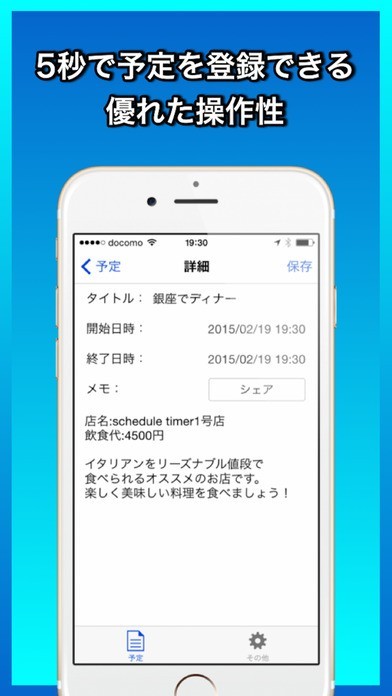 スケジュールタイマーは、より仕事を効率的に進めていってほしいという願いを込めて作られたアプリです。予定が一覧で表示されるのでいつ自分がどこで何をすべきなのかが把握しやすいデザインとなっています。単にタスクが羅列されているだけではなく、必要となる時間やどれくらいの猶予があるかということも一目でわかりやすくなっています。また、新しく予定を登録するのが面倒になってしまわないように最短5秒で登録できる操作性も魅力の一つです。