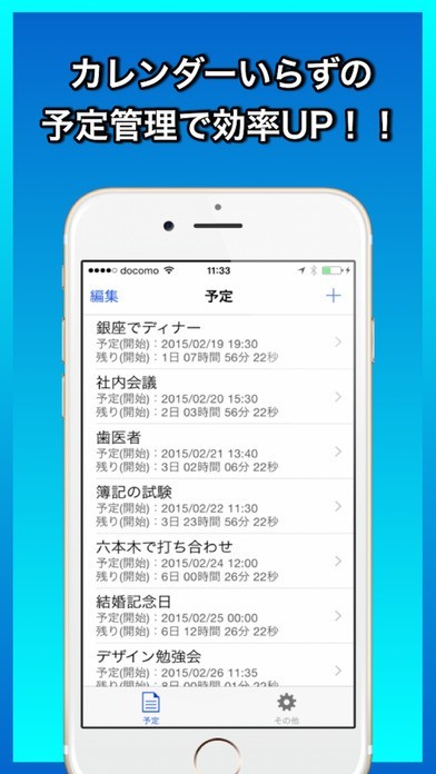 一分一秒も無駄にしたくない人にオススメのToDoタイマーアプリです。せっかく予定を組み立ても、つい後回しにしてしまったり、作業に夢中になって予定を忘れてしまったりと、なかなか予定通りに物事を進めるのは難しいことです。このアプリは、予定の開始時刻と終了時刻をあらかじめ登録しておくことで、カウントダウン表示で予定を確認することができるので、いつまでに、どの予定を終わらせなければならないかをすぐに確認することができ、予定に取り組む意識を高めることができます。使い方もシンプルで、タイトル・開始日時・終了日時を入力するだけです。メモを残すこともできるので、必要事項も忘れずに管理することができます。