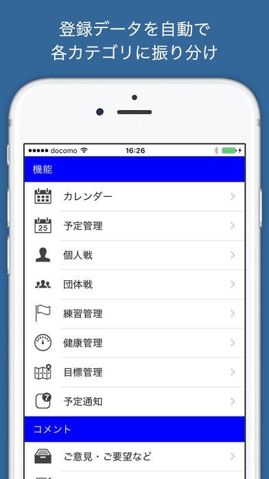 毎日の練習の記録にも最適!登録したデータは自動的に各カテゴリーへと振り分け!