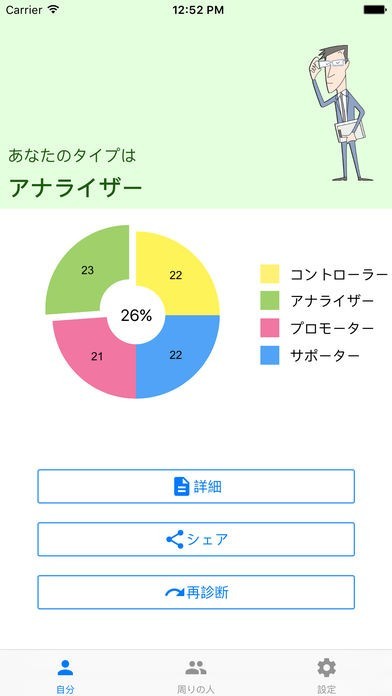 人を管理するコントローラー、情報の収集や処理に向いているアナライザー、発案が得意なプロモーター、誰かを支えるタイプのサポーター、はたしてあなたはどのタイプでしょうか。このアプリでは40問の簡単な診断でタイプ判定を行ってくれます。
