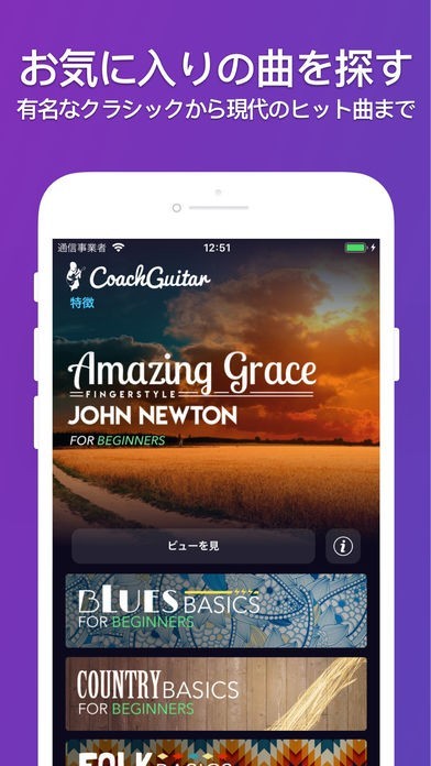 アプリ「Coach Guitar - 初心者のためのギター講座」では、難しい専門用語や音楽理論の話を一切抜きにして、ギターの弦の色分けや実際に引いているときの写真などを活用し、目で見るだけで内容をしっかり理解できるように工夫を凝らして作られたレッスンを通じて、ギターの弾き方を自分のペースで習得することができます。レッスンを進めていくだけで、誰もが知っている有名な楽曲のコードやその押さえ方が分かるので、誰でも気軽に弾き語りに挑戦できます。