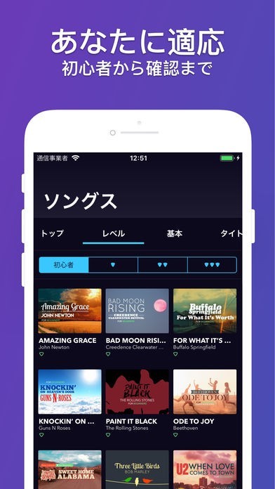 『Coach Guitar - 初心者のためのギター講座』は、ギターの講座を受けることができます。講座は全部で12種類あり、初心者向けの基礎講座が充実していることが特長です。講座は視覚と音を使っており、ギターを始めたばかりの人でも素早く弾き方をマスターすることができます。また、基礎が身につくだけでなく、有名な楽曲を弾けるようになります。「 CoachGuitar(コーチギター)」を使えば、ネック部の図や動画を使用しており、有名楽曲を引くための訓練をしてくれます。アプリには誘導画面があり、とても見やすくなっているので操作は簡単です。講座は有料のものもありますが、お手頃な値段なので手軽に使うことができます。
