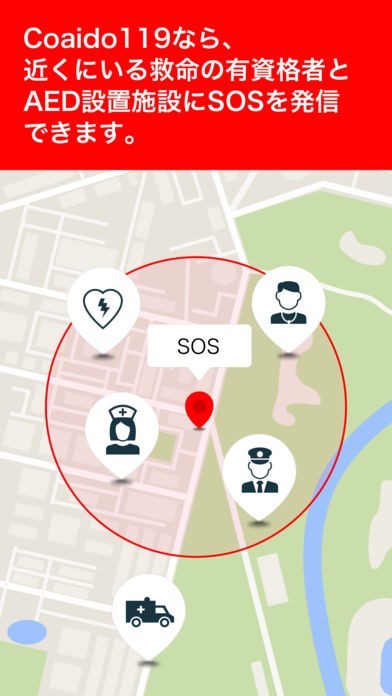 App Storeより引用目の前で家族が突然倒れて意識を失ったとき、Coaido119なら救急車を要請しながら周囲の救命知識のある方にも助けを求めることができます。もしものときのために今すぐダウンロードしてください。