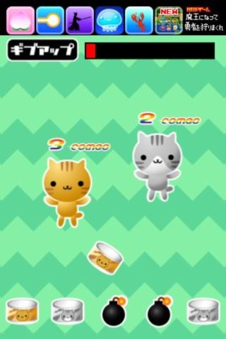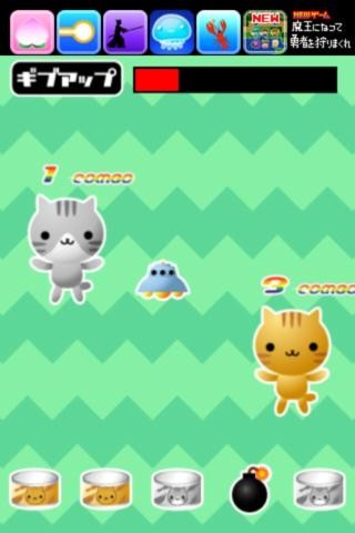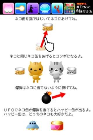 ねこ缶を与えたい猫に向かって指先ではじくと得点がもらえ、爆弾に気を付ける