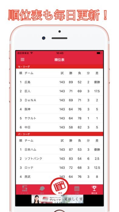 試合日程や順位などの基本的な情報はもちろん、スポーツ紙やブログなどのちょっとしたサイドストーリーも拾い上げるので、情報に飢えているファンにはたまらないアプリです。