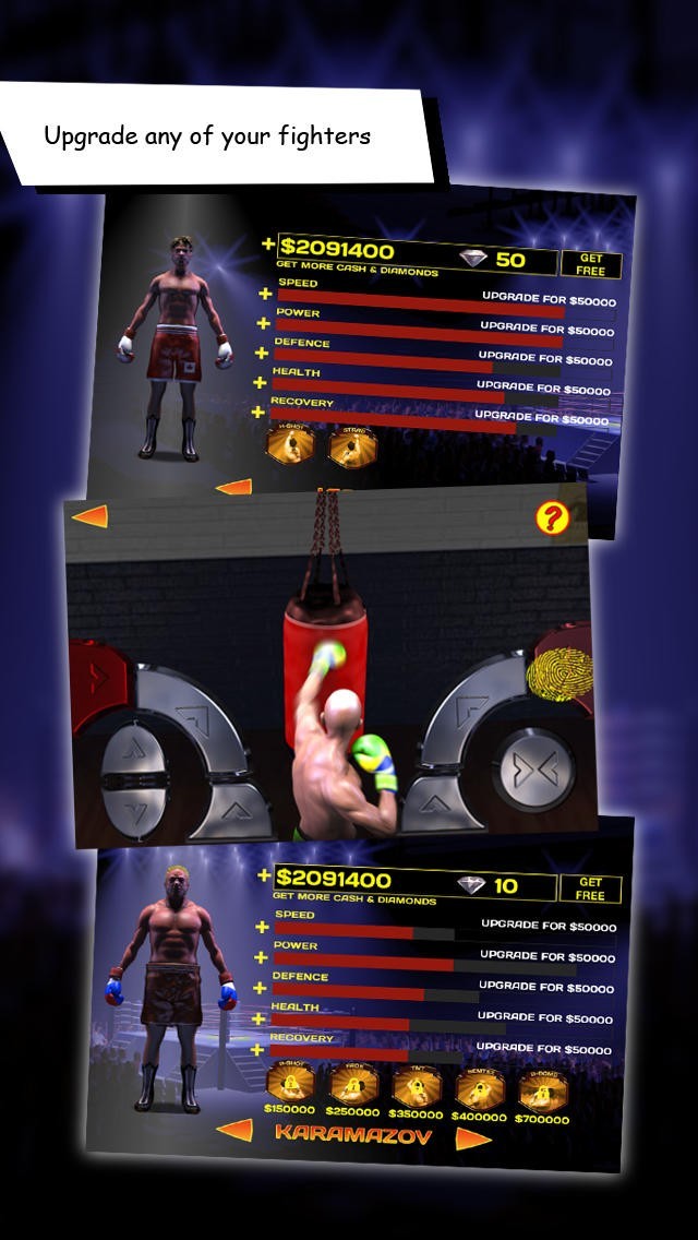 Improve your speed to turn your hands into a lightening blur. Boost your power and watch them buckle under a single shot and make your fighter unbeatable with health, defence and recovery.