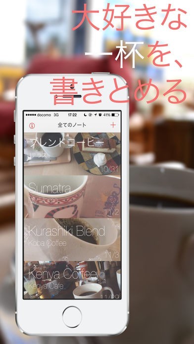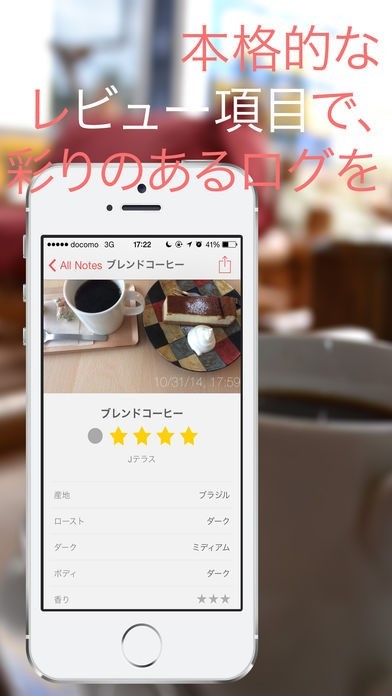 App Storeより引用コーヒーノート for iOSは、ふと立ち寄った喫茶店や、豆にこだわり抜いたお気に入りのカフェで飲んだ、大好きな一杯のコーヒーを記録し、評価し、書きとめていくアプリです。産地、香り、酸味、甘味、後味など本格的な項目からレビューを行い「あのときに飲んだ一杯」を思い返させてくれます。