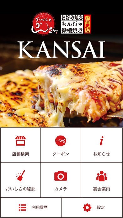お好み焼き・もんじゃ焼き・鉄板焼き専門店「KANSAI」の公式アプリです。「CLUB KANSAI」に会員登録することでお得なクーポンがその場でゲットできるほか、毎月お得な特典が用意されています。クーポンが届いたときはプッシュ通知でお知らせしてくれるのでお得な情報を見逃しません。メニュー確認や店舗検索機能も付いており、利用する際に参考になる情報が満載です。