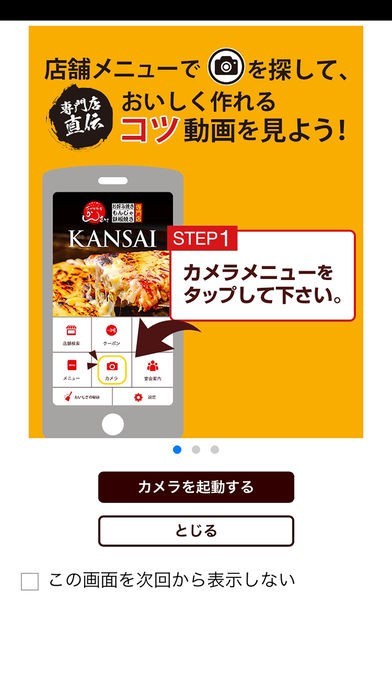 店舗メニューの画面に表示されているカメラボタンを押してみましょう。専門的直伝のお好み焼きがおいしく作れるコツ動画が見られます。せっかくなら動画を参考にして美味しくお好み焼きをいただきましょう。