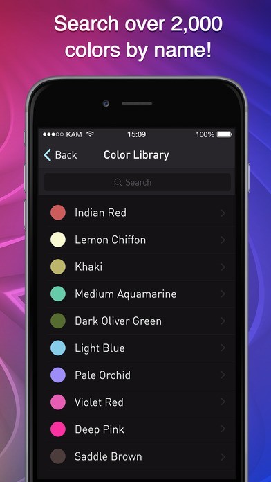 Color Name - identifierでは、収録されている色の名前が確認できるカラーライブラリーが搭載されており、様々なバランスにある色の名前を知ることができます。