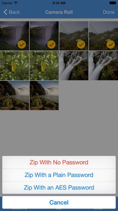 「iZip」にはZIPファイルへの圧縮と解凍機能が付いています。 クライアントにインターネットでファイルを納品する場合、ファイルサイズを小さくするために圧縮する事がありました。 そんな時にあると便利なのがこのアプリです。 スマホのカメラロールに保存してある画像や動画ファイルもそのまま圧縮できます。 パスワード無しzipの時はzip with no passwed、普通のパスワードzipの時はzip with a plain passwed、AES付きパスワードzipの時はzip with an AES passwedをタップして使用します。 ZIPファイルをパソコンに移動せずにスマホで管理したい時に役立ちます。
