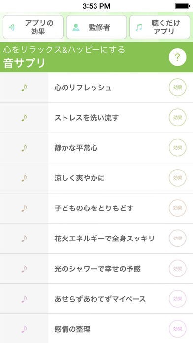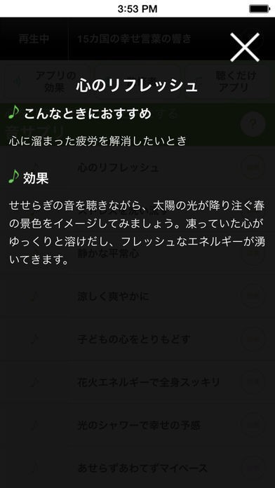 心のリフレッシュやストレスを洗い流すなど、サウンドの効果がテーマ名に表現されているので悩みや解消したい内容に近いサウンドを選択することができます。また、効果ボタンをタップすれば詳しいサウンド効果についての説明を見ることもできます。