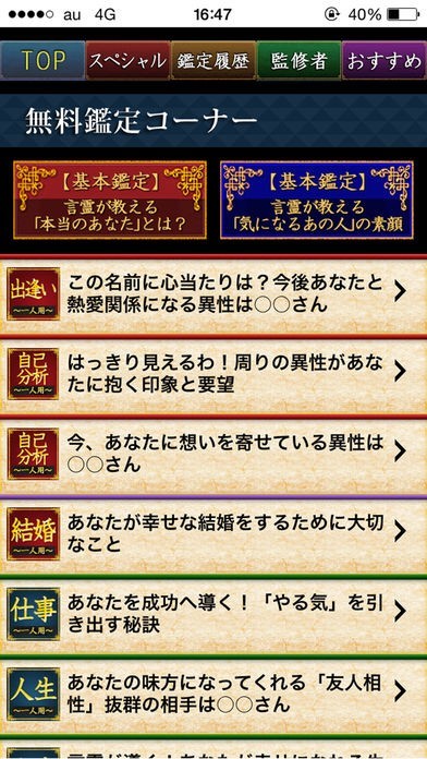 「芸能人も虜の的中鑑定!宮沢みち◆言霊姓名占」は、名前だけで占いができるお手軽なアプリです。「名前だけで当たるの?」と思うかもしれませんが、多くの芸能人や有名人が絶賛する「宮沢みち」が鑑定してくれるのでご安心を。占い内容は、全部無料で占い放題!恋愛、やる気、結婚、お金、仕事etc、多岐にわたります。これらにプラスして、スペシャル鑑定の有料メニューもあります。「もっと突っ込んだ占いをしてほしい」時は、別途料金を支払ってください。