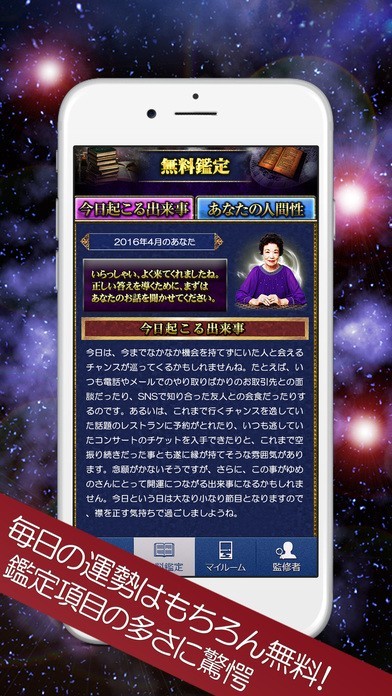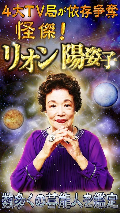 「怪傑!リオン陽姿子 -4大TV局が依存争奪・業界パニック!-」は30年以上、25000人以上のホロスコープ鑑定実績を持っている人気の占い師のリオン陽姿子氏による鑑定を受けることができるアプリです。テレビなどのメディアへの出演回数も多いリオン陽姿子氏による親身なアドバイスを受けることが出来るので、占いの結果をどのように生かしていたらいいのかも分かりやすくなっています。毎日の運勢は無料で利用することができるので一日一回占いを楽しめます。