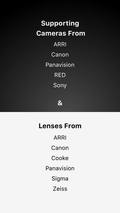 Included is a long list of common motion picture camera & lens sets. To see what lenses & cameras are supported, visit: getcinescout.com