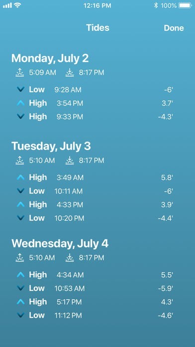 App Storeより引用Live Tides is a beautiful tide tracking app. Visually see exactly where the current tide cycle is. Easily check tide charts for the next 14-days with a detailed tide chart.