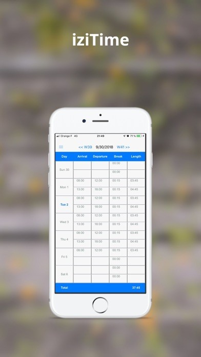 到着して仕事を離れるときにiziTimeを起動することによって、彼の時間記録を非常に迅速かつ正確に取り込むことが可能です!