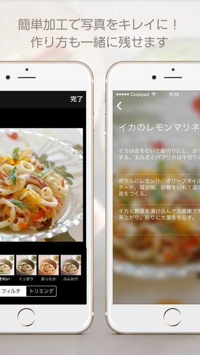 「お料理アルバム byクックパッド」は自分で作った料理の写真をスマートフォンのカメラでどんどん撮影することできれいに整理して保存することができるアプリになります。撮影した料理の写真は自動的に日付ごとにカレンダー形式で表示をすることができるんで、いつ作った料理なのか、この日に何を食べたのかが一目瞭然になります。料理の写真にフィルターやトリミングできれいに加工をすることもできるようになっているので見栄えの良い写真を残すことが出来ます。写真と一緒にメモやレシピを残すこともできるようになっているので、料理をおいしく作るためのポイントなども書き込めます。