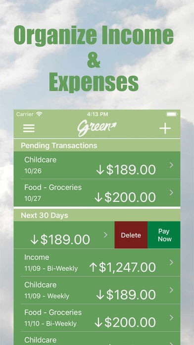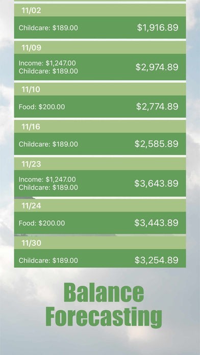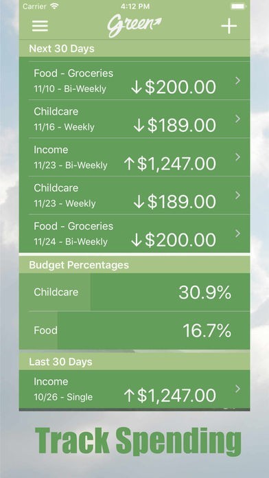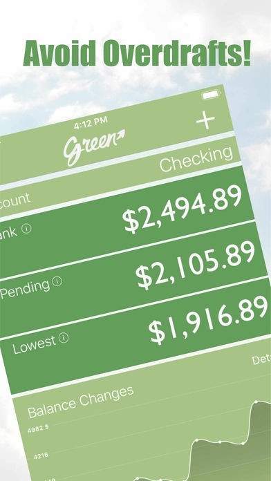 Green lets you budget without having to budget. Green is not just another generic budgeting app. It is an income and expense tracking app with balance forecasting that automatically predicts your changing account balances over the next year.