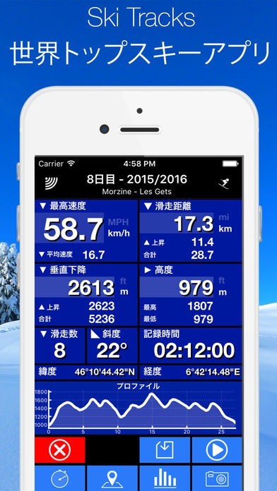 Ski Trackは世界トップスキーアプリで世界のどこでも利用できます。特別に開発されたスキー分析機能があって自分のスキーの滑りをしっかり記録してくれます。高度なマッピング機能もあって初心者もベテランも使えます。