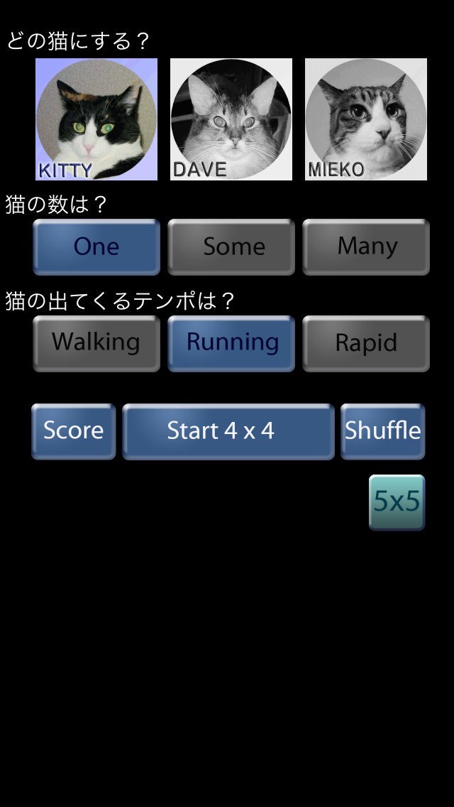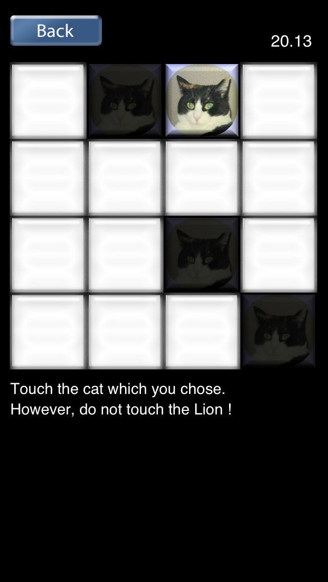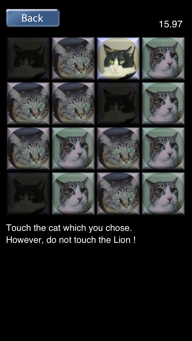 縦4マス横4マス、計16マスの目に次々と表示されるネコをタッチで消していき、全てのネコを消し終えた時間を競う無料ゲームアプリです。 プレイでターゲットとするネコは3種類あり、その中から1つをチョイス。 あとは、ひたすらマスに表示されるネコをスピーディーに消していくだけ。 自分のレベルに合わせて、表示されるネコの種類をプラス2、プラス3と増やしていくこともできます。 要所要所でカモフラージュのライオンもでてきて、難易度をあげることもあるので要注意です。 表示スピードは、3速の中から選択可能で、ビギナーからエキスパートまで対応可能。 さらにこのアプリ、ゲームしながら動体視力や反射神経のトレーニング効果も期待できます。
