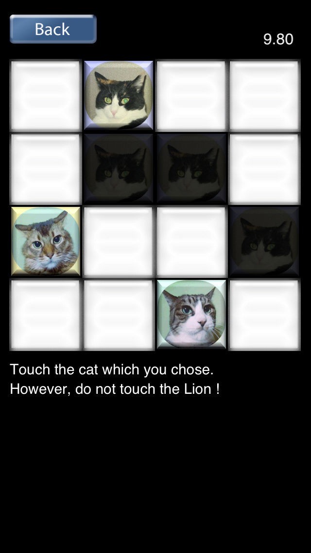 可愛い猫の画像が登場するパネルアクションゲームで猫好きの方に最適、ライオンを避け猫のパネルを素早くタップするのが攻略の鍵