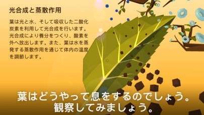 インタラクティブに反応する3Dシミュレーションを用意しており、育てた木が大きくなっていく様子を見守ることができます。付加セクションとして成長過程の解説も収録し、お子様の教材としても役立ちます。