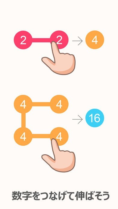 タイル状に並べられた数字のうち、縦横で隣り合った同じ数字をスワイプでつなげて消していくパズルゲーム「2フォー2」。つないだ数字は、つないだ数によって決まる得点と同じ数になってスワイプの終点の位置に残り、それ以外の数字は消滅します。消えた数字のスペースは上にあった数字が落ちてきて埋められ、空いた上部のスペースには新しい数字が落ちてきます。できる限りたくさんの数字を消して高得点を目指しましょう。つなげられる数字がなくなったらゲームオーバーです。