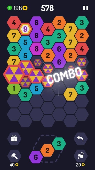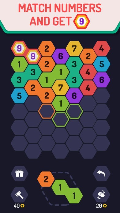 App Storeより引用Up 9は、ハマり度満載の新しいパズルゲームです!数字の描かれた六角形を蜂の巣型のグリッドにはめていきます。同じ数字を隣同士に重ね合わせていき、9にしましょう。