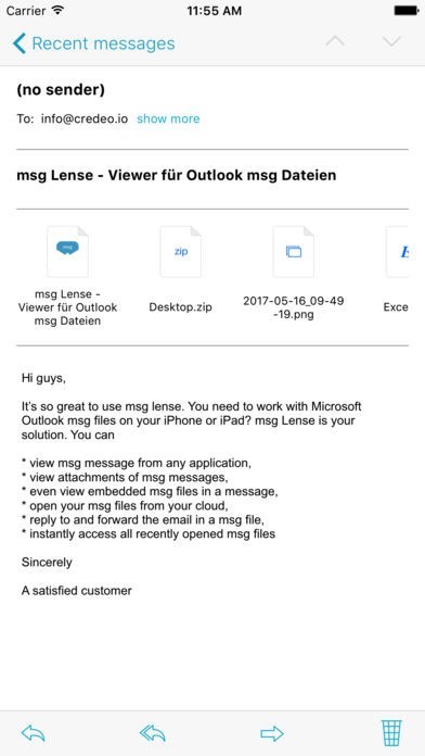 App Storeより引用Easily view and work with Microsoft Outlook msg files on your iPhone or iPad. With msg Lense you can
