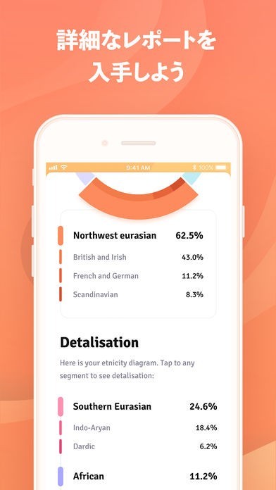 アプリのフェイススキャナーの助けを借りて自分のルーツを辿りましょう。最新の顔読み取り技術を用いて顔のすべてのパーツを分析し、詳細なエスニシティ報告を提供します。顔の写真を撮るだけで、あとはアプリがやってくれます!