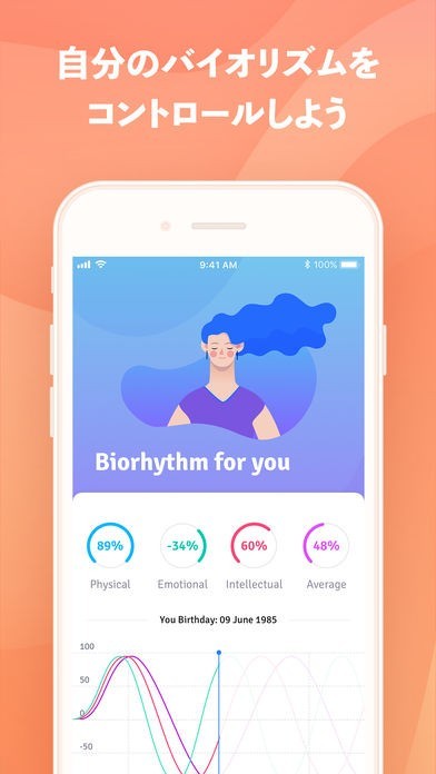 このアプリは占星術に基づく予測とともに、バイオリズムのグラフも提供します。誰もが良い日や悪い日、幸運や失敗を経験します。人の生活は健康状態を調節する生物学的な周期の影響を受けています。バイオリズムを知ることで賢い生活上の決定をできるようになります。
