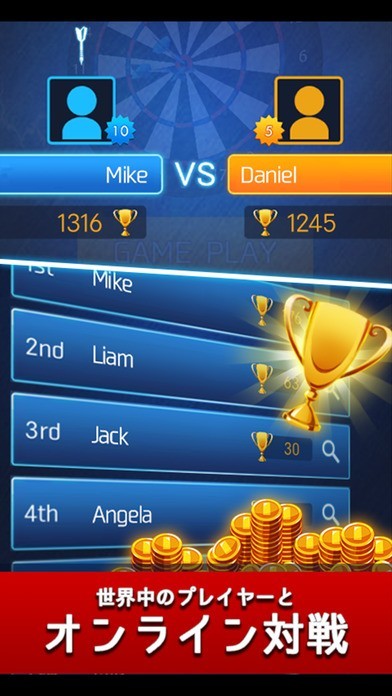 - ランキング機能:世界中のダーツプレイヤーと競う合うワールドランキング機能です。