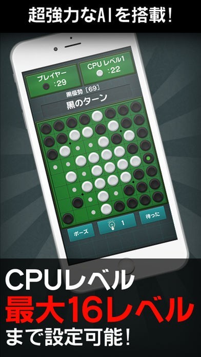 タップ操作で手軽に石がひっくり返せるようになっています。また徐々にCPUの難易度が向上していくので、オセロ上級者の方でもじっくりと遊べるでしょう。次の一手を指南してくれるのも便利な点です。