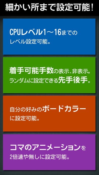 様々な難易度に対応していて、COMと自由にオセロ勝負出来るようになっています。アニメーションの速さを変更する事が可能なので、隙間時間に対戦したい際にも便利ですよ。