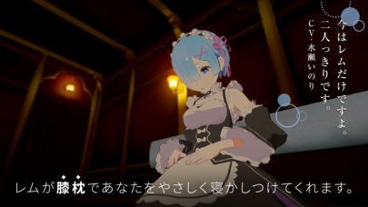 このゲームは人気アニメ「Re:ゼロから始める異世界生活」のキャラクターのレムに膝枕をしてもらう事ができます。新規撮りおろしボイスと共に彼女とのひと時を楽しめます。