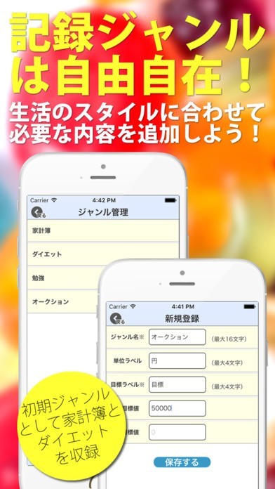 記録ジャンルごとに管理出来るので、家計簿以外にも記録出来る